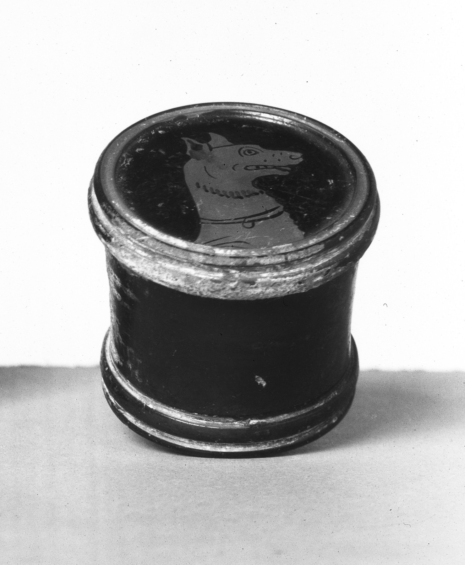<p>The lid of this red-figure pyxis depicts the head, neck, and chest of a dog, to the right in profile with a collar around its neck.</p><p>For the latest information about this object, <cite><a href='https://purl.thewalters.org/art/48.82' rel='external'>Pyxis with Bust of a Dog</a></cite>, visit the Online Collection of the Walters Art Museum.</p>
